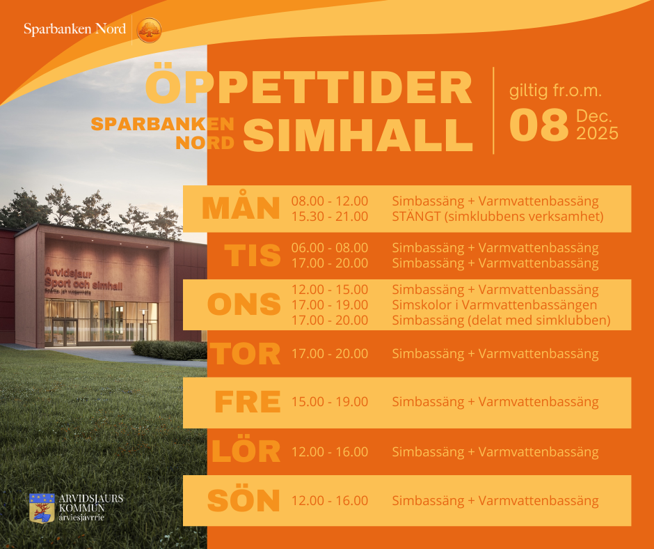 Efter invigningen av Sparbanken Nord Simhall, som äger rum lördagen den 6 december, startar den ordinarie verksamheten från och med måndagen den 8 december. Allmänheten kan njuta av den nya anläggningen 7 dagar i veckan.